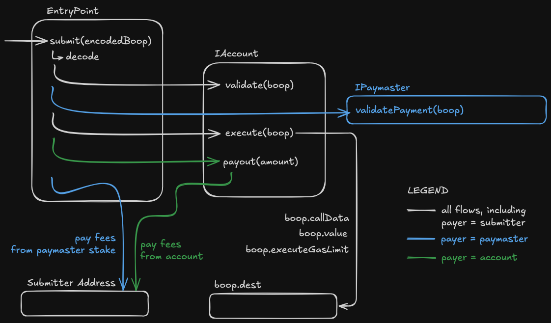 • execute(Boop) — This executes the operation specified by the boop. The function returns a structure indicating the outcome: whether the operation succeeded, reverted, or whether the account rejected the operation (typically because of malformed data). Since the function is not allowed to revert, it must catch reverts if calling external contracts that may revert. As indicated earlier, even if the call fails, fees will be paid and the nonce will be incremented.